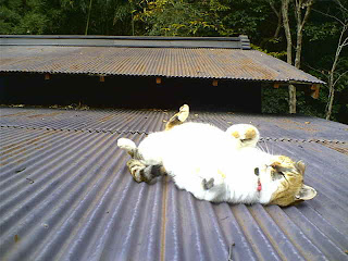 昼食を取り終えてボッとしていると、猫どもが落ち着かない、一点を注意深く眺めている。視線の先を追うと、なんと五匹の犬が隊をなして畑を横切っていきます。大きめな白い一匹が先導したり、最後尾で辺りの様子を見たり・・・。野犬かどうかも分かりませんでした。